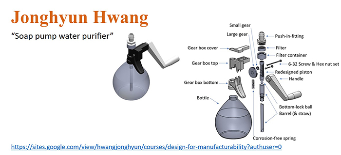 The winner of the competition was Jong Hwang, a MechSE junior. His portable, mini-size water purifier designed out of a discarded plastic hand soap pump was meant to be used by children who live near a contaminated water source. Liebenberg calls Hwang’s project “the most mechanically intricate design,” indicating that it was “brilliantly conceptualized, analyzed, and synthesized,” and adding that it has a “huge potential for repurposing in the ‘real world.’”
