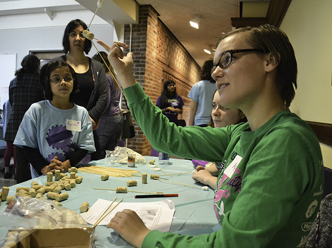 Liz Gacek, Mommy, Me, & SWE event chair, reports that she had added incentive to participate in SWE’s outreach: “Well, my sister is actually here at the event, and I just like to see her have her mind blown along with all the other girls!"