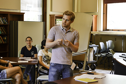 Math Day on Friday, August 11, introduced the high schoolers to a number of Illinois’ mathematicians, who made the students feel welcome and introduced them to some of the work that they do. Mathematics Department Head, Matt Ando, welcomed the students and discussed the importance of math. Assistant Professor Phillip Hieronymi introduced students to mathematical logic via a “brain teaser” about Alan Turing. Plus, several math Ph.D. students, Elizabeth Field, Alexi Gorman, Vanessa Rivera-Quinones, and Colleen Robichaux led the high schoolers in hands-on activities related to math research.
